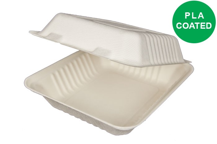 8"-1 PLA LAMAINTED compartment, bagasse hinged container, 150/case